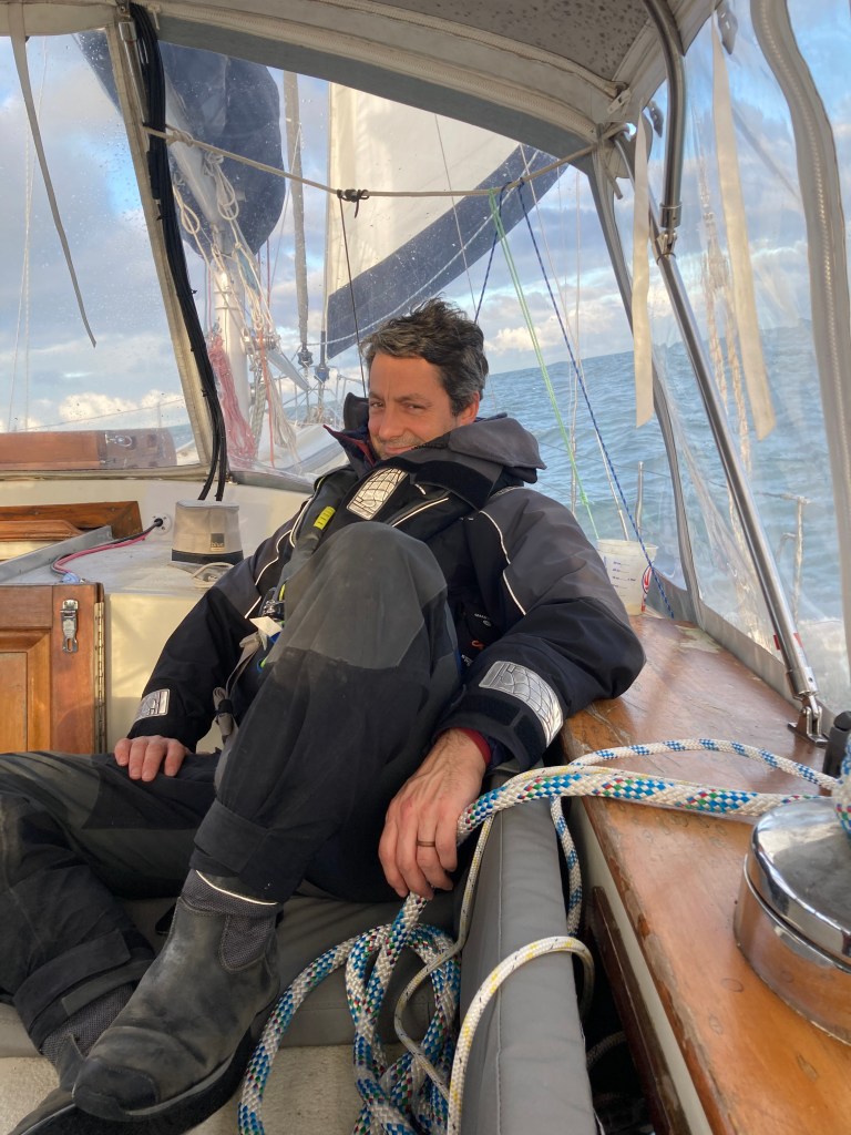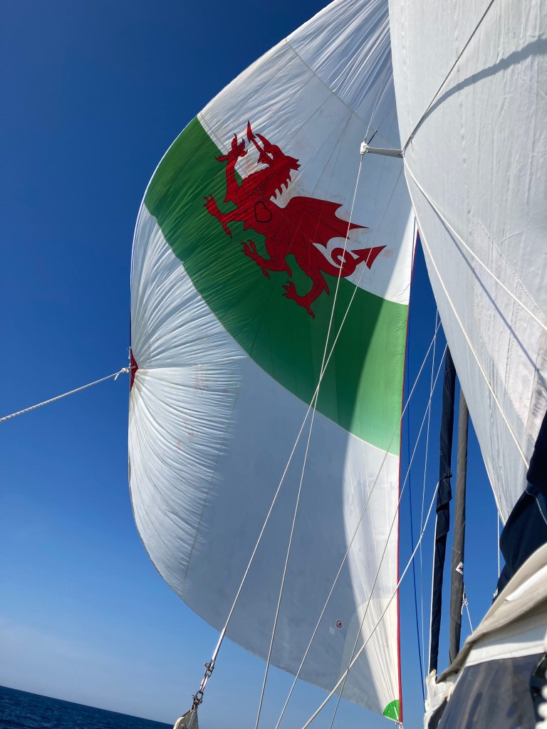 Quite a pleasant day, massive push from the tide has given us really good speed even through under engine as the winds were too light to sail. However, once they picked up, it gave us time to deploy the dragon for the first. That’s our spinnaker, it’s a massive Welsh flag which is rather cool! It made the skipper rather happy as you can see by the picture.