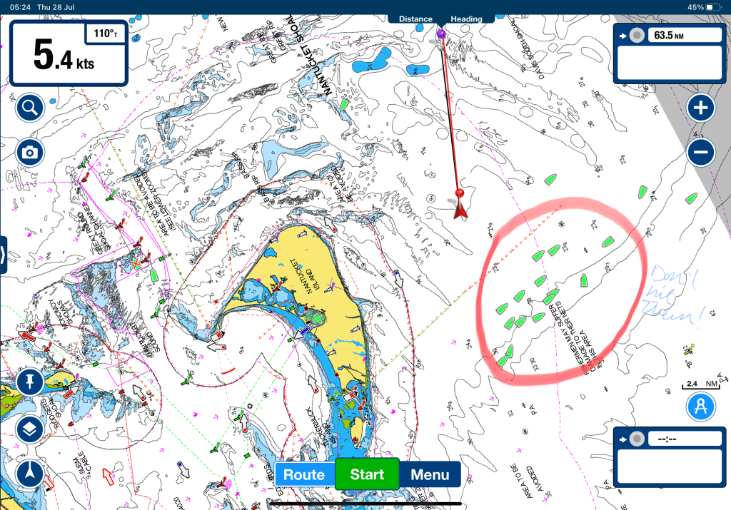 Arriving on watch to take over I had the briefest of handover as the skipper now resembled a leading character in the walking dead. “Go south, don’t hit anything” was the instruction before he scuttled of to bed. The don’t hit anything referred to a huddle of boats who had all positioned/ anchored themselves right where I wanted to go, how rude!